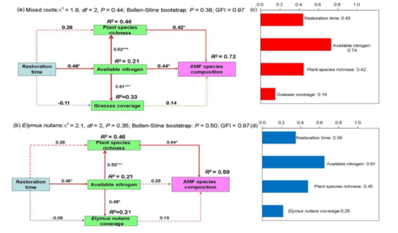 研究发现,在两种根系系统中共鉴定出46个AMF的基因型(混合根样:44个;垂穗披碱草根样:46个),主要归属于球囊霉科。两种根系系统的AMF物种丰富度随恢复时间的增加呈现单峰曲线的变化,且在三年后达到峰值。在混合根样中,土壤速效氮不仅直接改变了AMF物种组分,且通过植物物种丰富度间接改变了AMF的物种组分。在垂穗披碱草根样中,仅速效氮通过改变植物物种丰富度而驱动了AMF物种组分的变化。在两个研究尺度中,垂穗披碱草作为黑土滩恢复草地中的一个关键种,会增强土壤速效氮对AMF群落装配的调控作用,这表明在高寒草地恢复演替过程中科学管理土壤速效氮会增强“植物和AMF”的互惠共生关系,因此会延缓恢复草地发生“二次退化”现象。