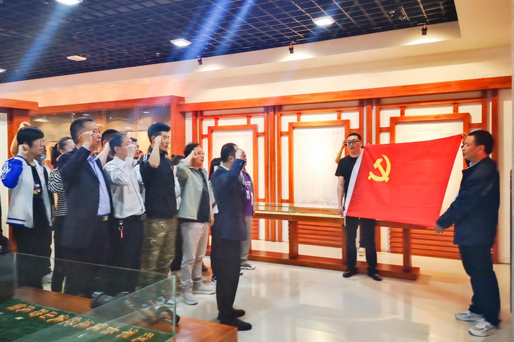 在纪念馆内,全体党员师生举起右拳,在鲜红的党旗下,庄严重温入党誓词,表达永远忠诚于党,忠诚于共产主义事业的决心。